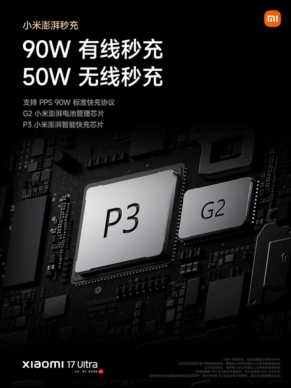 小米17 Ultra配备了6800mAh金沙江电池,支持90W有线快速充电和50W无线快速充电,在连续重度使用场景下,其续航时长较上一代15 Ultra最多延长了近6个小时。