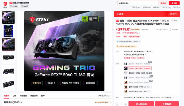 微星 RTX 5060 Ti 16GB GAMING TRIO OC 魔龙显卡目前售价3999元,PLUS会员实际支付价为3979元,正值双十二平价促销。据悉,配备16GB显存的RTX 5060 Ti显卡可能面临停产,有意购买的玩家需尽快行动。
