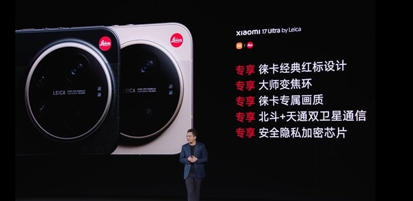 相较于小米17 Ultra,小米17 Ultra徕卡版拥有专属的徕卡经典红标设计、专属的大师变焦环、专属的徕卡画质、专属的北斗+天通双卫星通信功能,以及专属的安全隐私加密芯片。