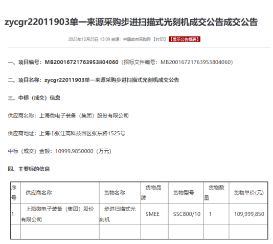 在中国政府采购网上编号为zycgr22011903的采购公告显示,科技部通过单一来源采购方式购置了一台步进扫描式光刻机,该采购项目的中标金额约为1.099亿元,中标供应商为上海微电子公司,所采购货物的型号为SSC800/10。
