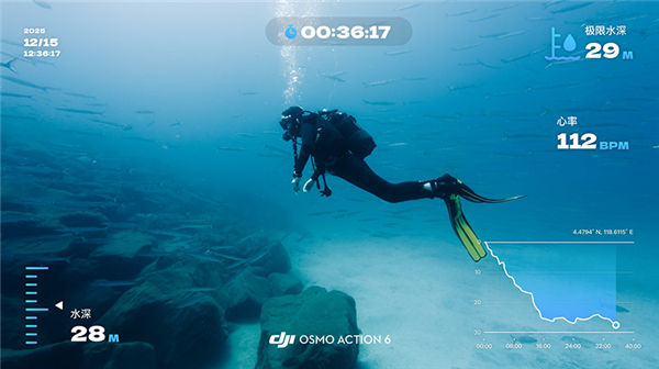 针对潜水爱好者,仪表盘新添了“水深曲线”和“极限水深仪表”两项功能,不管是平面视频还是全景视频都能添加。导入带有水深数据的素材后,就能直观呈现深潜的轨迹、最大水深等信息,还可以搭配心率、经纬度之类的数据。