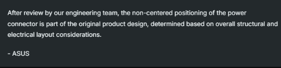 华硕方面回应称:“经工程团队评估,电源接口未居中是原始产品设计的一部分,这是综合考虑整体结构与电气布局后做出的决定。”显然,华硕并不认为这是设计缺陷,而是产品从一开始就确定的设计方案。