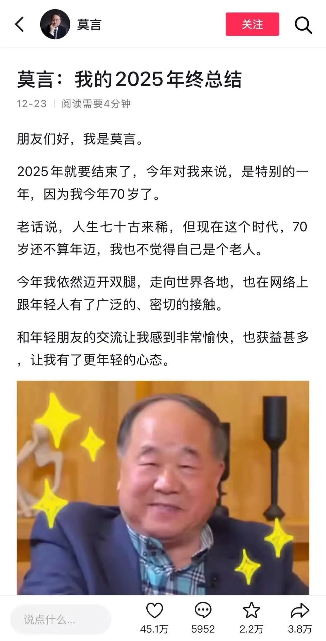 比如,作家莫言借助这一功能推出了2025年的年终总结文章。与此同时,一些普通创作者分享的个人故事和感悟类长图文也受到了广泛关注。另外,许多专业媒体也开始运用长图文功能来呈现深度报道,从而满足用户对于新闻事件更全面信息的需求。