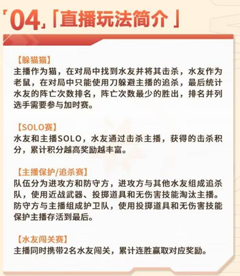 保护/追杀赛规则:水友分为两队,追杀队只能使用近战武器和投掷物来淘汰主播,护卫队则依靠无伤害技能保护主播存活至比赛结束。