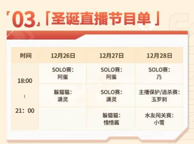 12月27日18:00进行SOLO赛(由潇灵参与),21:00则有躲猫猫活动(惜惜酱参与)以及水友闯关赛(小雪参与)。