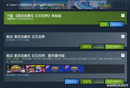 值得一提的是,不只是线下热闹非凡,随着年末的临近,《索尼克赛车 交叉世界》也在各大平台开启了大促销!正好赶上Steam冬季促销活动,这款游戏还迎来了史上最低的优惠价格。从现在开始,一直到2026年1月6日凌晨两点,《索尼克赛车 交叉世界》普通版享受30%的折扣,豪华版的折扣力度更大,达到了35%。