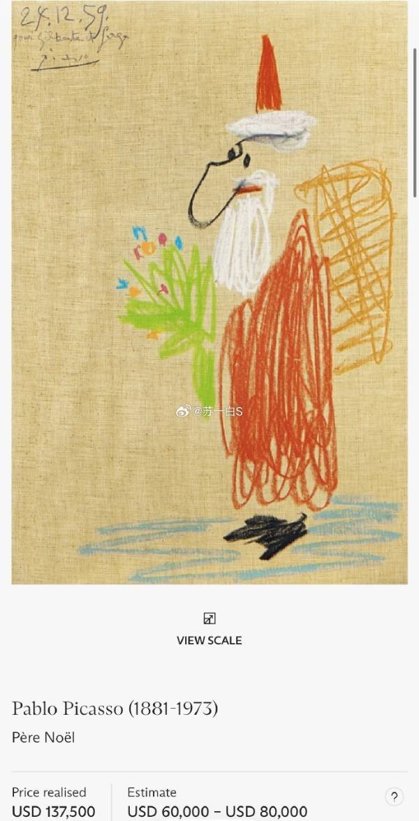 这幅乍看像孩童涂鸦的画作,其实是毕加索在1959年平安夜创作的《Père Noël(圣诞老人)》,用简约的线条勾勒出圣诞老人的形象。