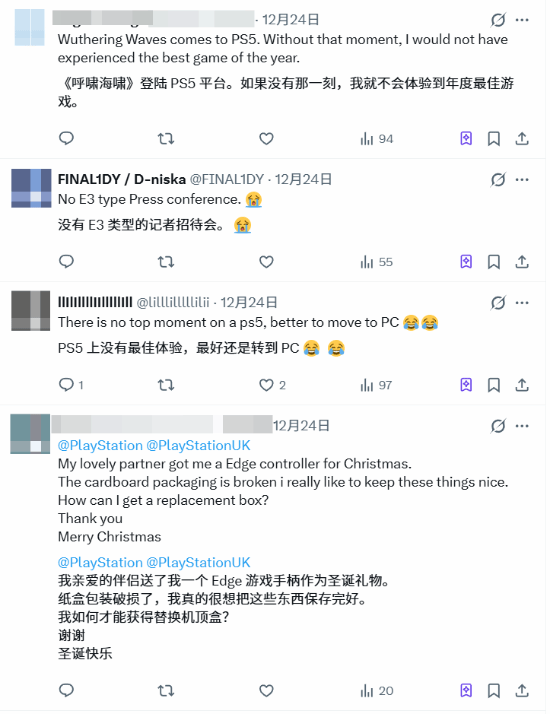 当然,仍有不少PS的死忠玩家在坚守阵地。有PSVR2用户对《杀手:暗杀世界》的沉浸感赞不绝口,“用一条鱼解决所有敌人”成了他的年度难忘时刻。此外,《死亡搁浅2》达成白金成就以及《鸣潮》登陆PS5,也收获了一些死忠粉的认可与点赞。
