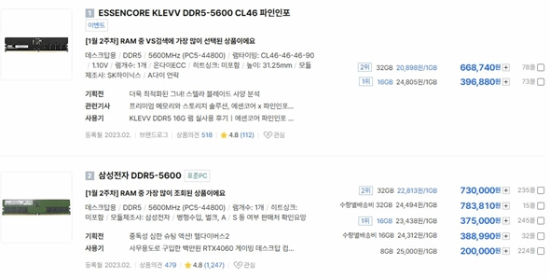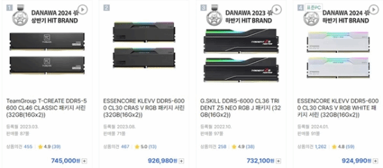 关于一套支持Intel XMP或AMD EXPO的16GB*2内存套装,当下在韩国的售价处于730,000到926,000韩元的区间,换算成人民币已经超过4380元,而这尚且不属于高端产品范畴。