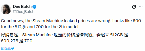 他明确驳斥了此前流传的高价信息,称:“告诉大家一个好消息,之前泄露的Steam Machine定价并不准确。其中512GB版本的合理价格应为600美元(约合人民币4330元),2TB版本则是700美元。”