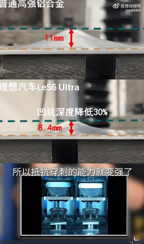 像视频里呈现的理想自主研发的2000MPa热成型钢2000IH,在增强强度的同时,借助独特的微合金设计,并未降低韧性,因此在实际测试中的表现要显著优于市面上同等强度的热成型钢。