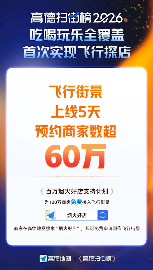 1月13日消息,高德地图新推出的“飞行街景”功能,上线仅5天,预约商家数量就已突破60万。