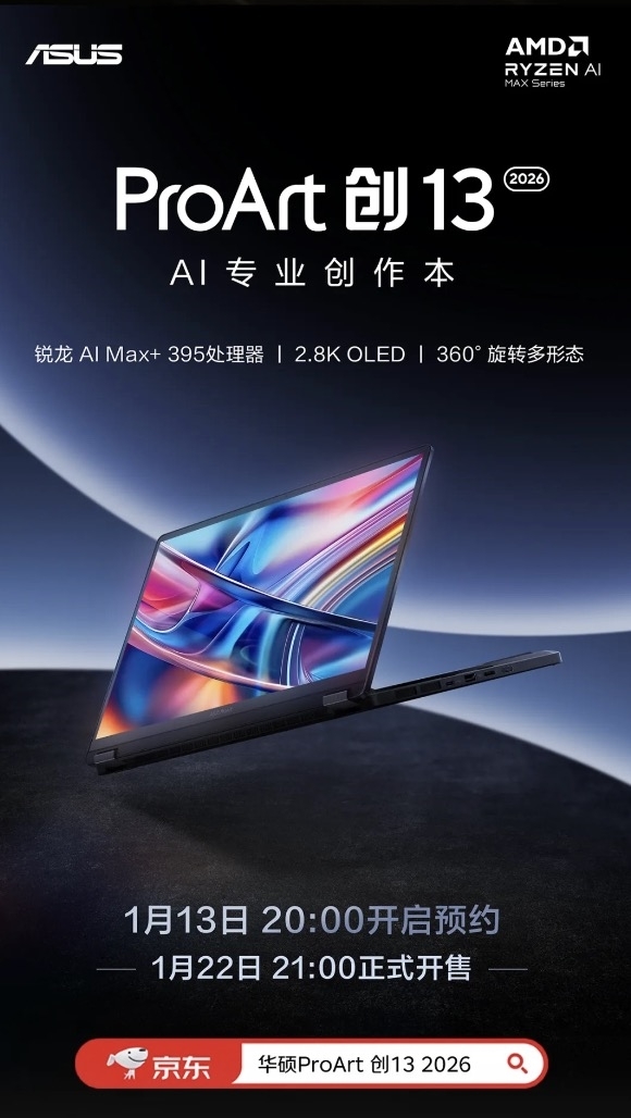 北京时间1月13日,华硕轻薄本系列迎来四款新品的重磅发布,具体包括华硕ProArt创13 2026、华硕灵耀16 Air 2026、华硕a豆14 Air 2026以及华硕无畏Pro14/16 2026。这四款新品均搭载了AMD最新推出的锐龙AI系列处理器,涵盖锐龙AI 400系列与AI MAX系列。该批次新品已于今日20:00正式启动线上预约通道。