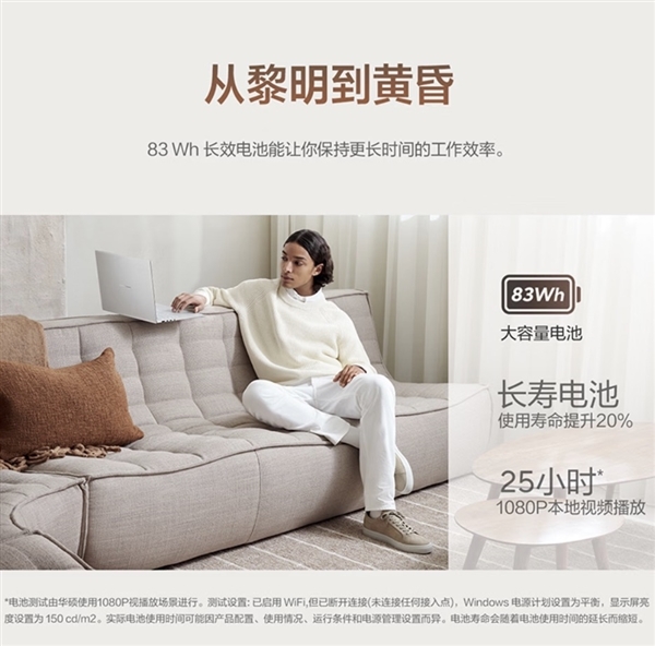 续航方面则是83Wh大容量电池,官方界面显示可至高25小时的持久续航,满足全天外出办公的电量需求,彻底缓解续航焦虑。