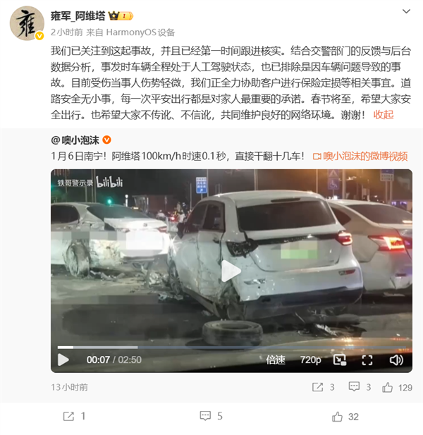 结合交警部门的反馈以及后台数据分析,事故发生时车辆全程处于人工驾驶状态,同时也已排除车辆自身问题引发事故的可能性。目前受伤当事人伤势较轻,我们正在全力协助客户处理保险定损等相关事宜。在此也呼吁大家不传谣、不信谣,共同维护良好的网络环境。