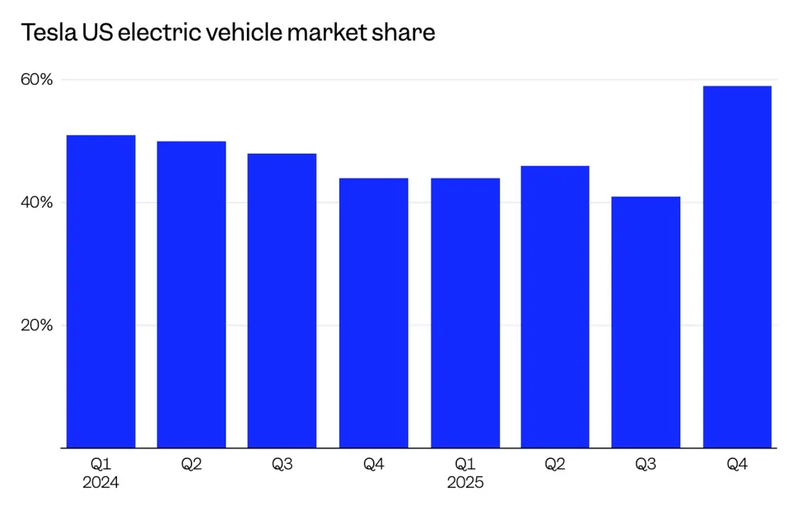 Cox的数据表明,特斯拉在美国电动汽车市场上的主导地位再次得到巩固,其市场份额在第四季度攀升至59%,相比上一季度的41%有显著提升。一个关键因素在于,美国的电动汽车企业如今需要在脱离政府补贴的情况下达成盈利目标,而在这一过程里,销量规模起着决定性作用。