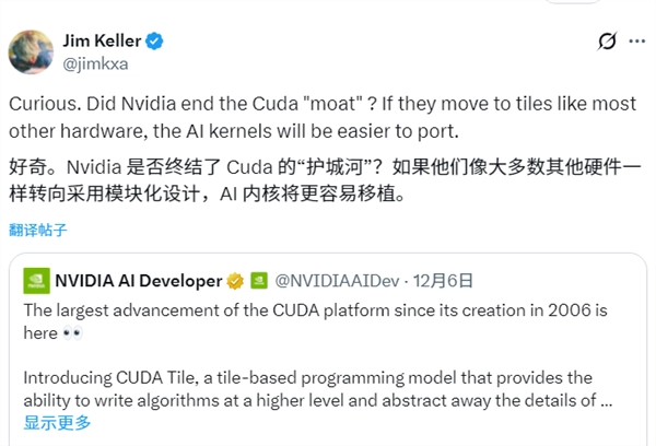 事实上,上个月NVIDIA推出CUDA 13.1时,就曾引发外界对NVIDIA“护城河”是否会被削弱的讨论,尽管官方称这是“自2006年CUDA平台问世以来规模最大、最全面的一次升级”。