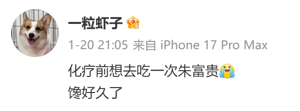 直到最新动态里写着“化疗前好想去吃一次朱富贵,馋了好久”,那一刻,一个在焦虑与期盼中努力维持生活气息的年轻女孩形象,才算彻底完整了。