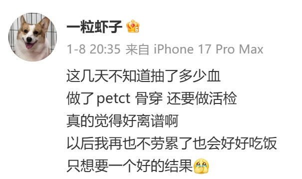 而在这之前,她的小号“一粒虾子”就已经记录下了更为真实的心路历程。在经历了抽血、骨穿、活检等一系列检查后,她曾写下这样一句话:“以后再也不劳累了,也会好好吃饭。”