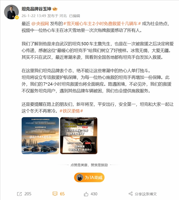 在这里我们坦克品牌表个态,绝不能让这些寒潮中的热心人单打独斗。