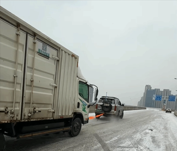 一位坦克500的车主停在堵车队伍的最前端,先是找到拖车盖,接着拧上拖车钩,还不忘叮嘱被救援的车辆,然后依次拖拽陷入困境的车辆,拥堵状况也随之逐步得到缓解。