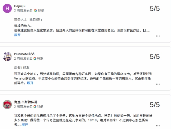 于是,当玩家们发现现实里真的有一家同名酒店时,自然按捺不住要整活一番。这家酒店的Google页面很快就被五星好评给淹没了,评论里一个劲地夸这里的“环境”,还留下了不少玩梗的内容。