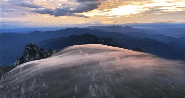 视频中,一层轻盈的雾气缓缓弥漫开来,如同一个半透明的帷幔将老君山整个笼罩。阳光倾洒而下,山上金色的建筑屋顶在光影中闪耀着璀璨的光芒,那景象宛如梦幻的仙境。