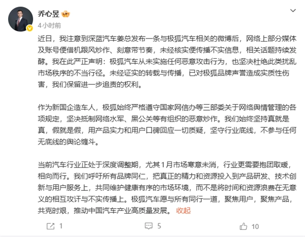 近日,深蓝汽车姜总发布了一条涉及极狐汽车的微博后,网络上部分媒体和账号趁机跟风炒作、刻意引导舆论,在未对信息真实性进行核实的情况下便大肆传播不实内容,致使相关话题不断发酵升级。在此,我郑重声明:极狐汽车从未有过任何恶意攻击的行为,并且始终坚决抵制此类破坏市场正常秩序的不当做法。对于未经证实就随意转载和传播不实信息的行为,已经对极狐品牌的声誉造成了切实的损害,我们将保留采取进一步法律追责措施的权利。