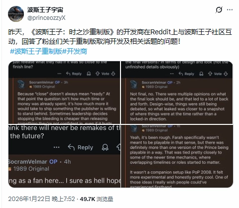 消息来自Reddit用户SocramVelmar,他自称参与了该项目。尽管原帖已被删除,但推特上的《波斯王子》粉丝@princeozzyX保存了这些发言。