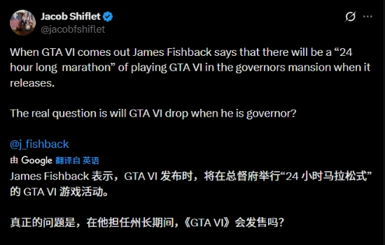 和众多游戏爱好者一样,佛罗里达州州长候选人詹姆斯·菲什巴克(James Fishback)也对Rockstar Games即将推出的《GTA 6》满怀期待。在1月23日的竞选活动里,菲什巴克向《GTA》的粉丝们承诺,若他成功当选,会在这款游戏正式发布的当天举办一场盛大的活动。