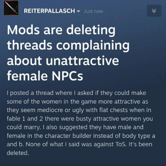 近日,有玩家称,《神鬼寓言4》的Steam讨论区版主正在大规模删除或关闭那些吐槽“女性NPC外形设计不尽如人意”的帖子。一位玩家表示: