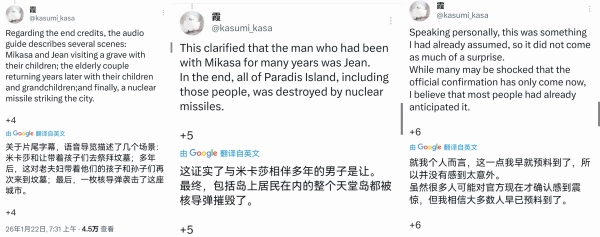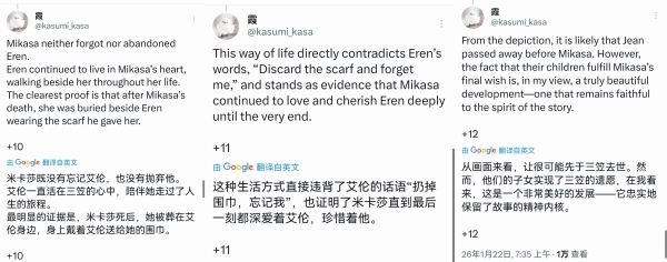“霞@kasumi_kasa”的言论开始在推特、贴吧、reddit等多个平台上被大量传播,内容是“艾伦坟前跪着三笠、让以及他们的孩子”,简单来说就是“让和三笠最后结婚并生下了孩子”。