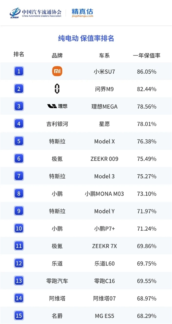 1月28日消息,近日由中国汽车流通协会与精真估联合发布的《2025年度中国汽车保值率报告》指出,小米SU7在纯电车型一年保值率排名中位居榜首,保值率达86.05。