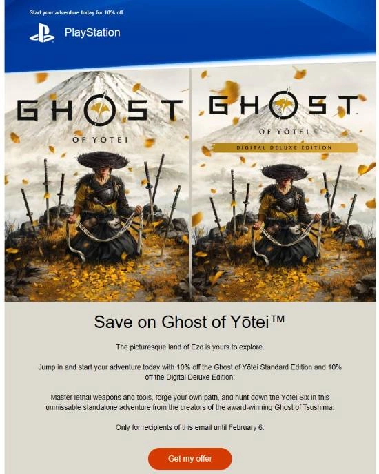 1月27日,索尼启动了向部分PSN用户发送《羊蹄山之魂》(Ghost of Yotei)专项优惠邮件的活动。