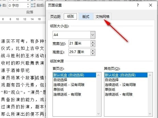 4、打开图标后,进入页面设置弹窗界面,在这个界面里找到“文档网格”选项,然后点击开启该选项。