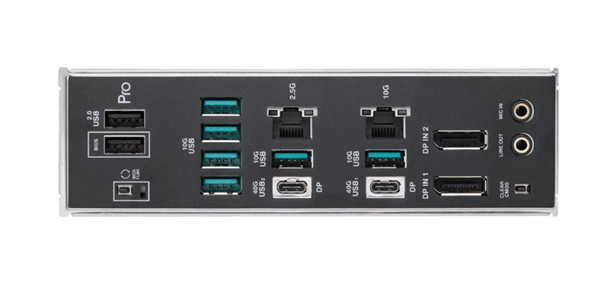 后置I/O面板配备了双Mini DisplayPort输入接口、一个VGA接口、两个USB4 Type-C接口、六个USB 10Gbps Type-A接口、两个USB 2.0 Type-A接口、一个10GbE网口、一个2.5GbE网口,还设有BIOS Flashback按钮、Clear CMOS按钮以及音频接口。