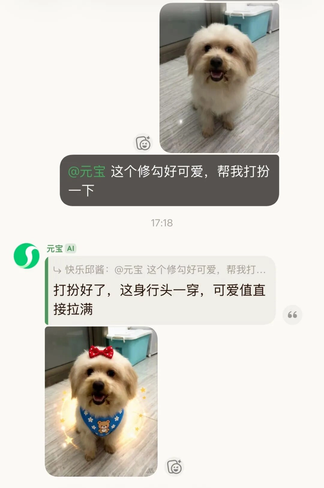 看到家里的小狗,太可爱了,赶紧让元宝帮我打扮一下,效果图还不错哦~