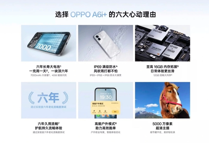 总而言之,OPPO A6i+ 精准锚定了追求实用与可靠的大众消费市场。它凭借1499元起的亲民定价,配合“国补”政策,大幅降低了用户获取高品质通信工具的成本;同时,以7000mAh超大容量电池、IP69级顶级防护以及天玑5G芯片为核心配置,打造出“超长续航”与“坚固耐用”两大核心产品优势。无论用户将其作为主力机型满足日常基础需求,还是作为备用机应对户外、多场景切换等复杂使用环境,OPPO A6i+ 都力求带来省心、安心的使用感受,堪称同价位段里兼顾基础性能与耐久品质的务实之选。