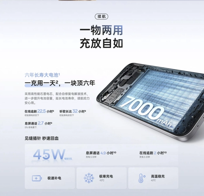 在性能表现方面,OPPO A6i 采用联发科天玑6300 5G芯片,足以应对日常社交互动、影音观赏和轻度游戏场景,并且支持5G网络,在基础性能与网络体验之间取得平衡;内存组合为LPDDR4X运行内存与UFS 2.2存储,还可通过拓展卡扩容,轻松满足日常多任务处理的需要。续航能力上,这款机型内置典型容量达7000mAh的大电池,不仅支持45W超级闪充和45W UFCS融合快充,还兼容33W及以下功率的超级闪充、第三方快充等多种充电协议,让用户无需再为电量问题担忧。