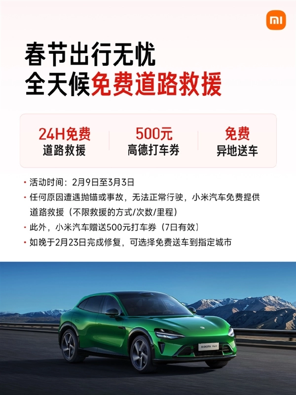 本次春节服务涵盖三大核心板块:一是提供24小时免费道路救援,活动期间用户车辆无论因何种情况出现抛锚或事故导致无法正常行驶,都能享受不限制救援方式、次数与里程的免费救援。此外,小米汽车还会为用户赠送500元高德打车券(有效期7天),要是车辆在2月23日之后才完成修复,用户可以选择免费的异地送车服务。