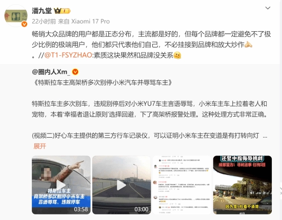 根据网友描述,特斯拉车主多次恶意别车,违规别停后对驾驶小米YU7的车主进行言语辱骂。当时小米车主车上载有老人和宠物,出于安全考虑遵循“幸福者退让原则”选择避让,驶离高架桥后立即报警。这种冷静理智的处理方式值得肯定。
