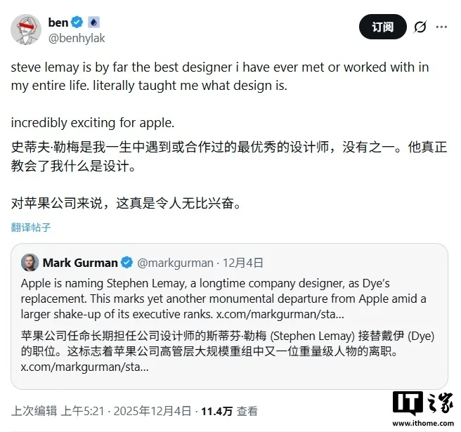 12月5日消息,科技媒体Cult of Mac于昨日(12月4日)发布博文称,苹果公司近期已任命史蒂夫・勒梅(Stephen Lemay)担任新任用户界面(UI)设计主管,以接替刚刚跳槽至Meta的艾伦・戴伊(Alan Dye)。