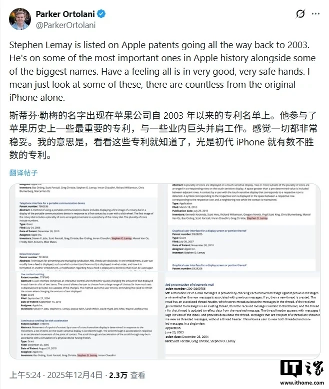 在美国专利数据库 Justia 中,Lemay 的名下拥有长达 53 页的专利清单,涵盖了从便携设备虚拟键盘、手势文本选择到电子设备手写输入等奠基性技术。