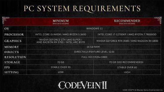《噬血代码2》PC配置需求现已正式公布!最低配置要求显卡为GTX 1660 Super及更高规格,在该配置下能够以1080P分辨率、30帧的低画质流畅运行游戏。而推荐配置则建议使用RTX 3080及以上性能的显卡,以此可实现1080P分辨率、60帧的高画质游玩体验。