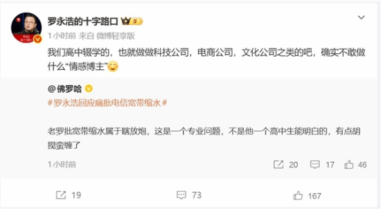 一位情感博主发文称,老罗批评宽带缩水是在瞎放炮,这是个专业问题,并非他一个高中生能搞懂的,未免有些胡搅蛮缠了。