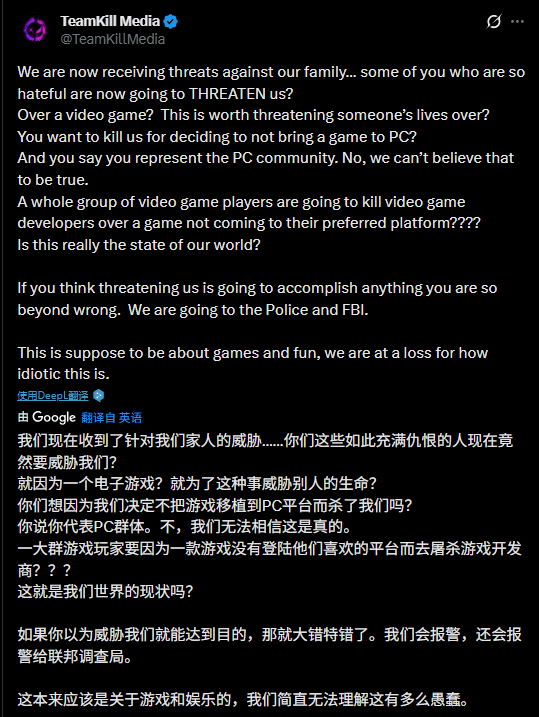 TeamKill Media今日发推表示,自己收到了针对家人的威胁,同时质问为何要带着如此深的仇恨去威胁他人生命,仅仅是因为一款游戏吗?难道仅仅因为游戏不移植PC、没登陆自己偏好的平台,就要对开发商痛下杀手?
