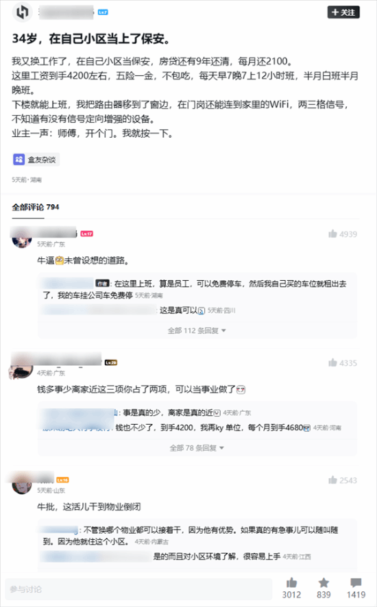 近日,一名34岁男性分享了自己的新职业——在其居住的小区担任保安,这一情况引发了众多网友的热议。