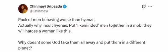 歌手钦玛伊·斯里帕达也发声表示:“这群男人的行径就如同鬣狗一般,总是这般骚扰女性。为何神明不将他们全都带走,放逐到别的星球去呢?”