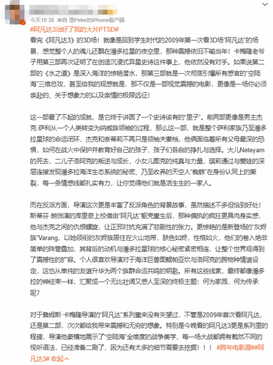看过的网友们纷纷表示:仿佛一下子回到了学生时代的2009年,第一次走进影院观看3D版《阿凡达》的场景瞬间浮现,整个人的魂儿好像还飘在潘多拉星球的璀璨夜空里,那份震撼人心的感觉,时至今日依旧丝毫不输当年!