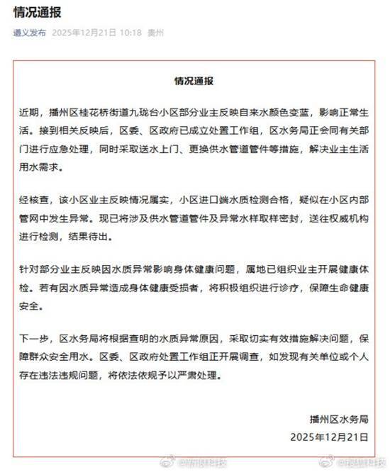 12月21日,贵州遵义播州区水务局发布通报表示,近日,该区桂花桥街道九珑台小区有部分业主反映自来水出现变蓝现象,对正常生活造成了影响。在接到相关情况反映后,播州区委、区政府已组建处置工作组,区水务局正联合有关部门开展应急处置工作,与此同时还通过送水上门、更换供水管道管件等方式,来保障业主的生活用水需求。